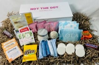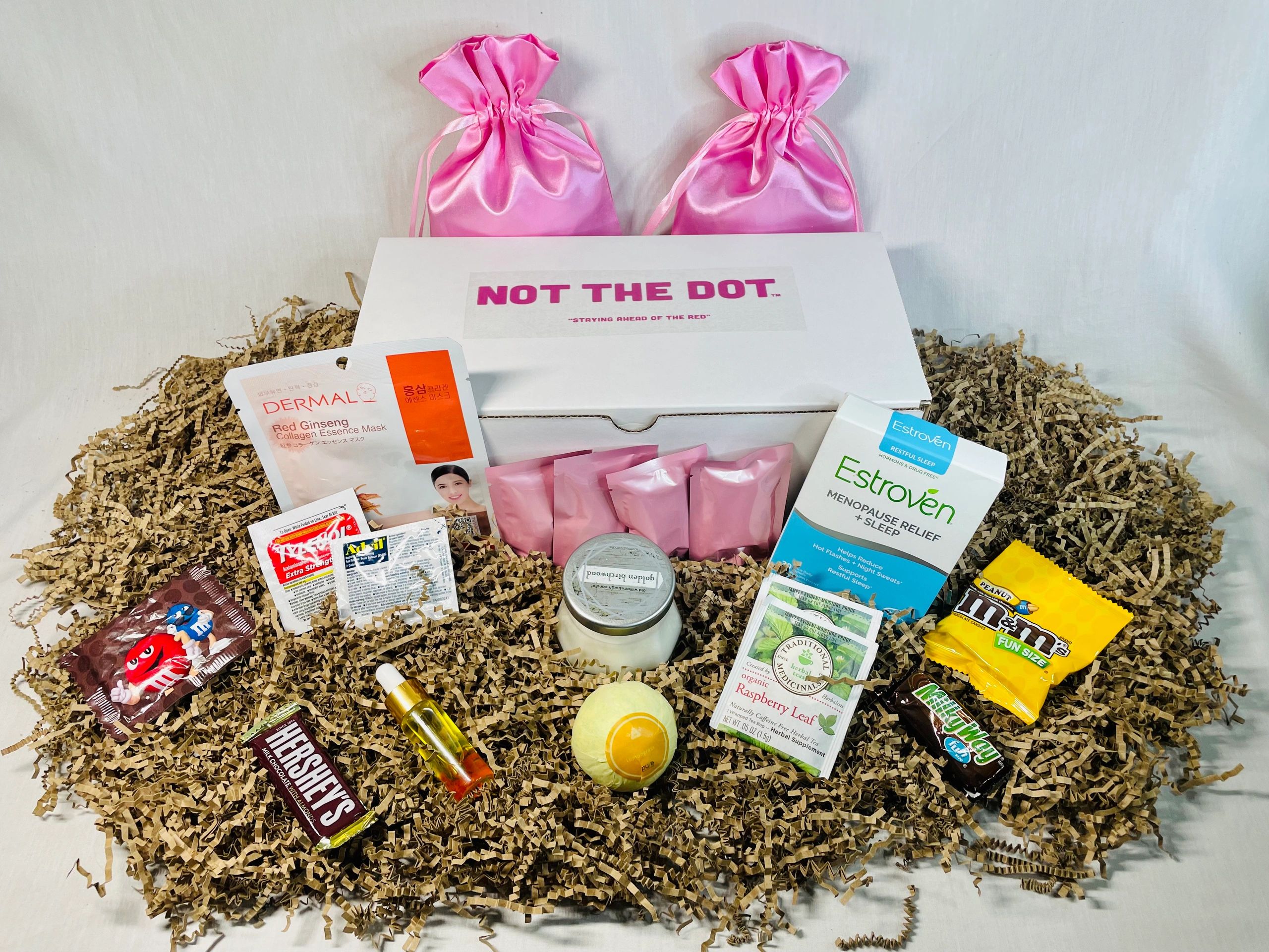Adulting Box (21+) – A luxe cycle care kit featuring wine coolers, pads, tampons, face mask, candle, bath bomb, vitamins, period treats, period panties, sanitary napkins, pain relievers, and raspberry leaf tea — blending comfort, care, and indulgence for every cycle.
