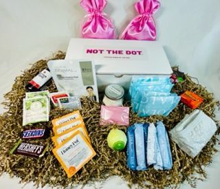 A self-care and cycle support kit with a face mask, period treats of choice, raspberry leaf tea, loofah, candle, bath bomb, period panties, assorted pads, tampons, and vitamins — designed to bring comfort, confidence, and care through every cycle.